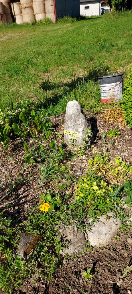 Ensuite Brezins ou je rencontre mon premier pèlerin vétéran, reconnaissable entre tous par la pierre installée dans son jardin et indiquant le nombre de kilomètres restants pour rejoindre Santiago. Il avait fait depuis Brezins le pèlerinage complet en 2013; café, une bonne heure d’échanges et je repars. Etonnant de constater combien ce pèlerin s’est dévoilé au plus intime avec moi, autre pèlerin différent mais pourtant tellement semblable. Je constaterai d’ailleurs cette facilité d’échange de multiples fois tout au long de ce pèlerinage. Le moment est venu de dire au revoir à ce nouvel ami.