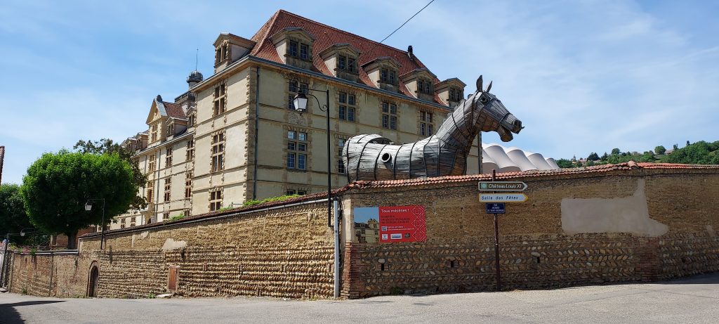 Le chemin devenu GR se faufile à mi-hauteur des terres froides jusqu’à la côte St André. C’est d’ailleur dans cette ville que je vais rencontrer mon premier cheval de Troie, probablement inoccupé.
